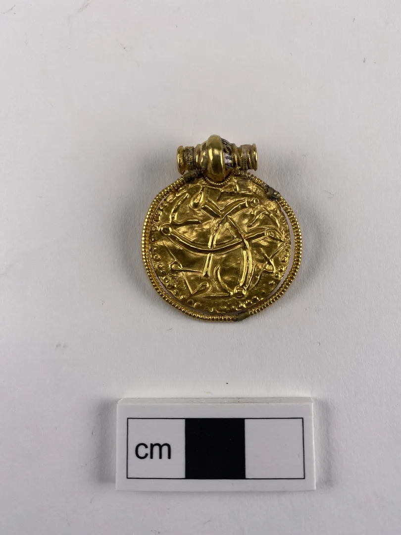 Somewhat later, in the 5th and 6th centuries AD, the “centre-parting hairstyle” remained in use. For instance, it can be seen in the details of the Ålleberg gold collar. But we also encounter an entirely new fashion in hair. This is displayed on a series of round gold pendants known as bracteates. Here a longer style dominates, gathered at the nape in something resembling a ponytail.