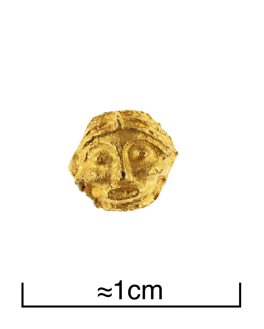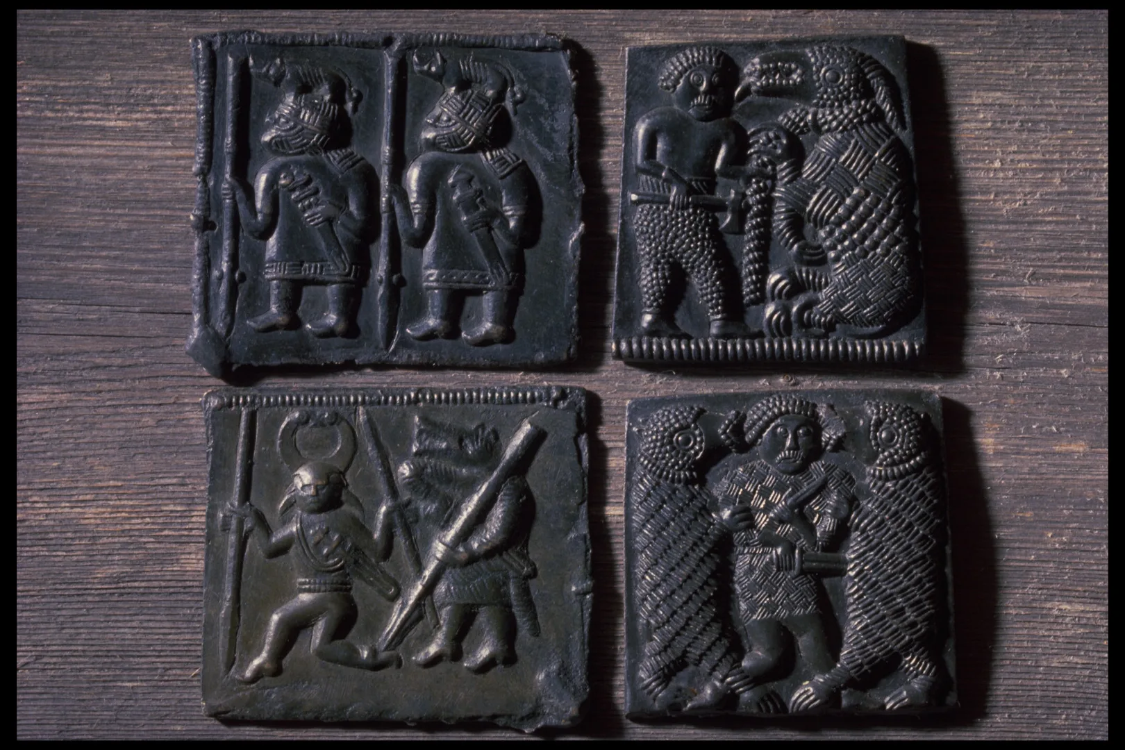 One intriguing group of human representations consists of small bronze plaques showing faces in frontal view. Four such pieces have been found on Öland, and a fifth probably on Öland or in Småland. They can be dated to the first centuries AD, or somewhat earlier. On them we are met by the favourite hairstyle of the Early Iron Age: a clearly marked centre parting with the hair combed to either side. Even though it is a pronounced simplification, the hairstyles seem to have been inspired by Roman models.